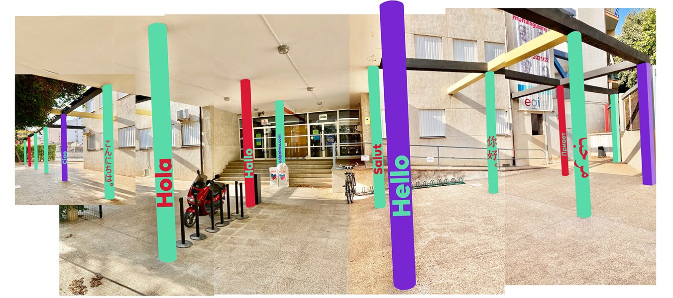 Así pues, las hasta ahora insignificantes columnas, cobran protagonismo con sus nuevos colores y dan la bienvenida a estudiantes, visitantes y profesores en los 10 idiomas que en la EOI se imparten.