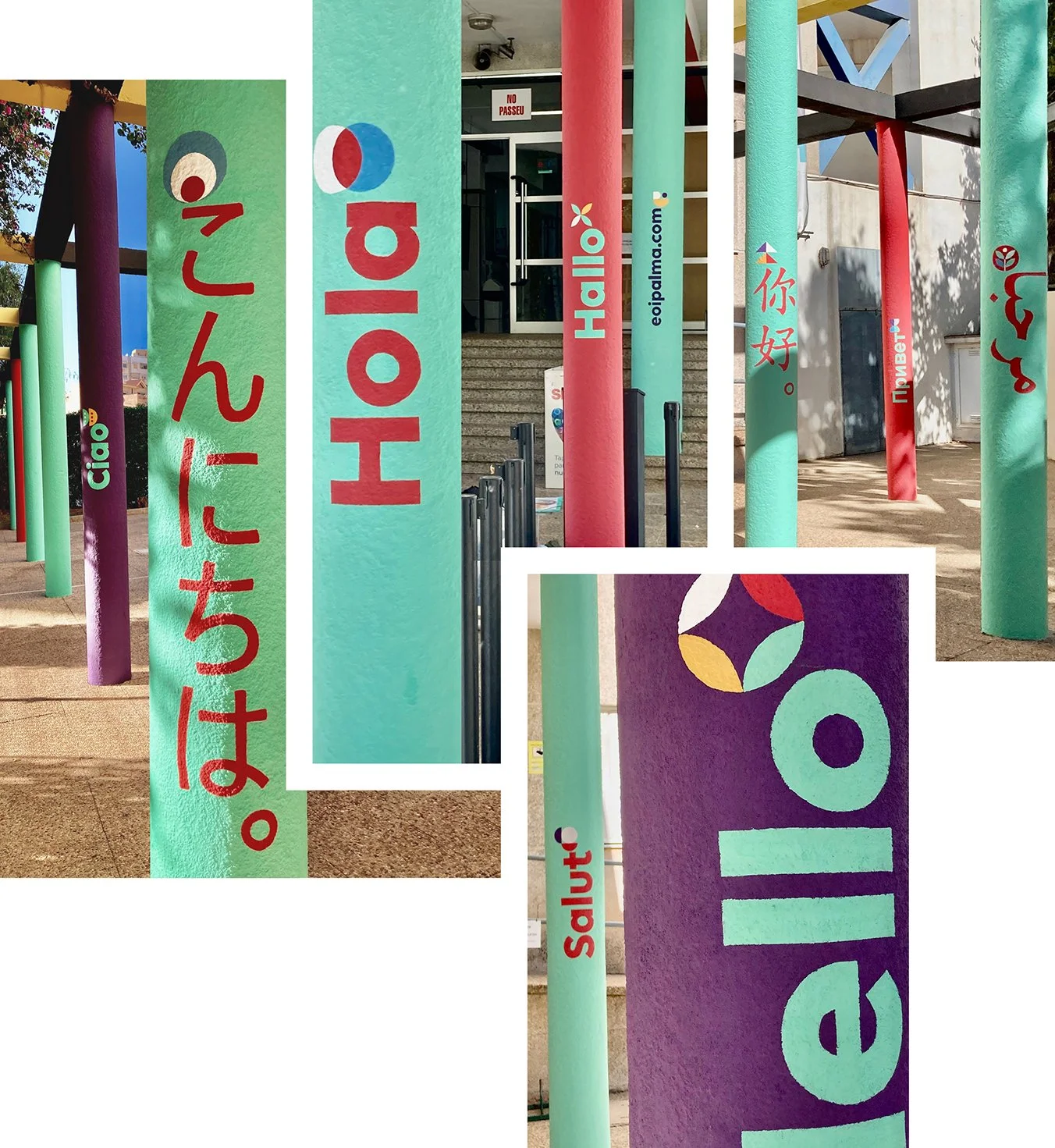Así que nuestra aventura continúa. Para crear un espacio favorable a la comunicación, decidimos que las columnas debían transmitir algo más a parte del saludo en los 10 idiomas que se enseñan en la escuela. Para ello, creamos una serie de símbolos específicos para cada idioma con la intención de hacer sentir el alma de cada lengua y su cultura.